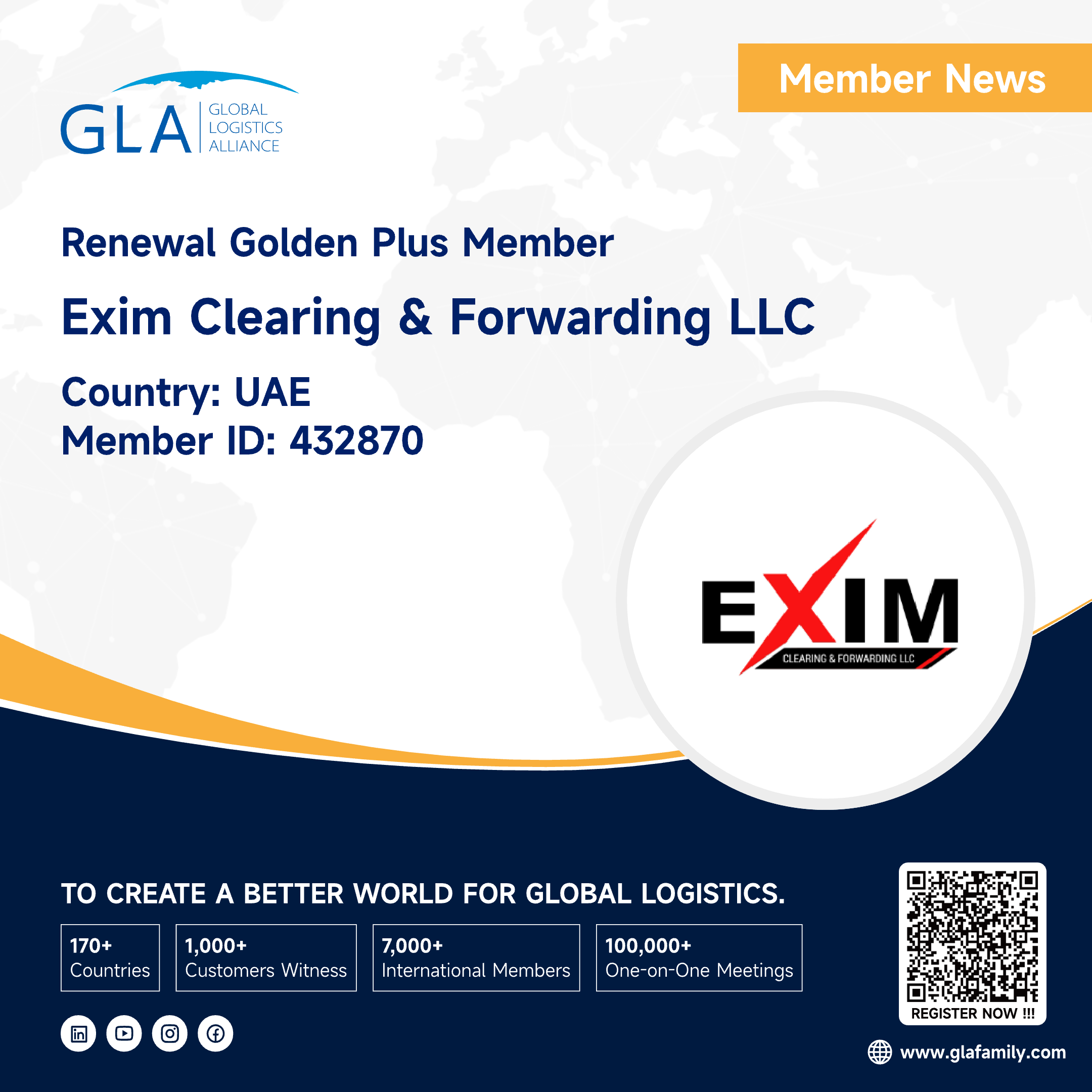 It is our great honor to announce that EXIM CLEARING & FORWARDING LLC has renewed GLA Family as a golden plus member from UAE, If you need UAE service, you can feel free to contact LIBINSHA.About EXIM CLEARING & FORWARDING LLCEXIM Clearing & Forwardin...